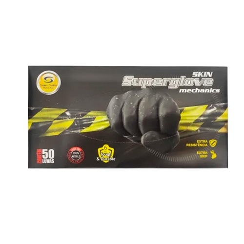 - Luva Nitrílica Preta Super Glove Automotivo e Industrial 50 Unidades CA 38645 com borracha nitrílica;
